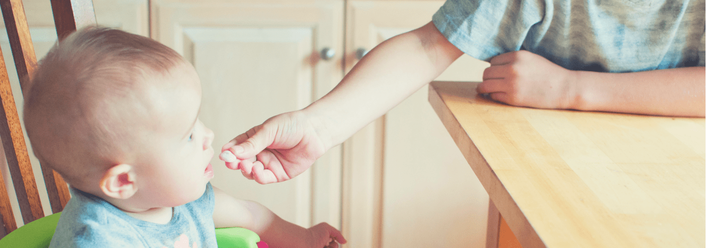 4. Sit behind your baby. In the early days, I always found brushing my babies’ teeth easier when they sat on my knee facing away. I would gently locate their mouth with my left hand and go in with the toothbrush with my right hand. You can feel your baby’s movements as you have more body contact and know if they are moving left or right and can adjust your own movements accordingly. I felt the baby was steadier and that I had a bit more control. Using the same logic, you can sit on a mess-proof mat or sheet with baby in front of you on your lap and feel their movements as they eat so you have a better idea of what they are doing. If spoon feeding, you can reach the spoon around to the front of baby’s face, feel the corner of their mouth so you can tell if their mouth is open or closed. Once they get to know the process of eating and realise how great food is, hopefully they’ll fidget less and you can progress to a high chair.